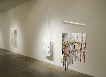 Adams’s flags look more like banners or scrolls and are suspended at eye level throughout the middle of the gallery. The junk mail has been painted white, then cut, scalloped, shingled, shredded, or rolled and carefully composed into six decorative banners and three wind chimes that hang from the ceiling by clean white cotton ribbons. The flyers’ original barrage of advertising graphics has been muted, the pages now ushered into a new existence with no overt semiotic messages.